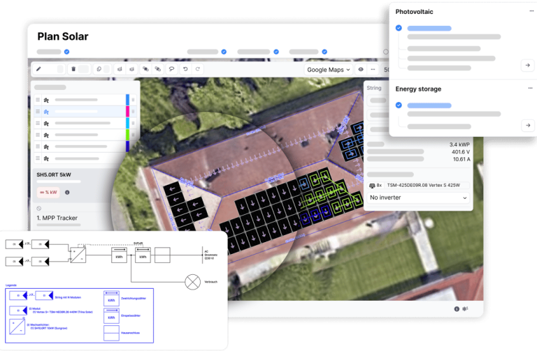 De la première prise de contact avec le client jusqu'à la préparation et la mise en œuvre de l'installation, tout est pris en charge : disposition des modules, planification des chaînes, calcul de la charge thermique, équilibrage hydraulique, établissement du devis et signature numérique. Le tout accompagné d'une gestion de projet complète, avec intégration des e-mails et du calendrier. Une solution tout-en-un.